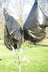understands the multitude of implications. One night last week the temps dipped down into the high twenties. Whats wrong with that, those are usual March conditions, right? Well yes, but remember that two week period of 70 and 80 degree temps? Those warm days triggered local flora to ‘go for it’…inducing extremely early blossoming and bud break on many trees. Some of these trees being cornerstones for local economies. Stone fruits(peaches,plums,cherries,etc.) were particularly premature in blooming. Their blossoms are very tender and cannot withstand frost. There you have it, confused trees put out flowers and then got zapped by the cold. The cherry industry in the Traverse Bay area took a hard blow; a friend reports that the entire crop for 2012 could be in the red…except not with plump, juicy cherries! Another reason not to put all your eggs in one basket. The only potential saving grace for these cherry farmers is the fact that the high winds associated with the cold temps inhibit frost from settling. Conventional farmers combat this with giant fans or ‘smudge pots’ (oil burning devices used to increase air temps ever so slightly) throughout the orchard. However, for most small farmers this is too costly and labor intensive. On a home scale it is much easier to protect plants from frost. Simply draping a tarp or blanket atop vulnerable specimens will help to prevent frost contact. The hardy kiwi vines in my garden did not appreciate the frost. They didn’t have flowers but they had leaves. Key word ‘had’. Even with protection the leafed-out hardy kiwi vines could not take the cold temps. Fortunately they will happily leaf out again when the conditions become favorable. Fingers are crossed that the apples will be okay. Some varieties are at
