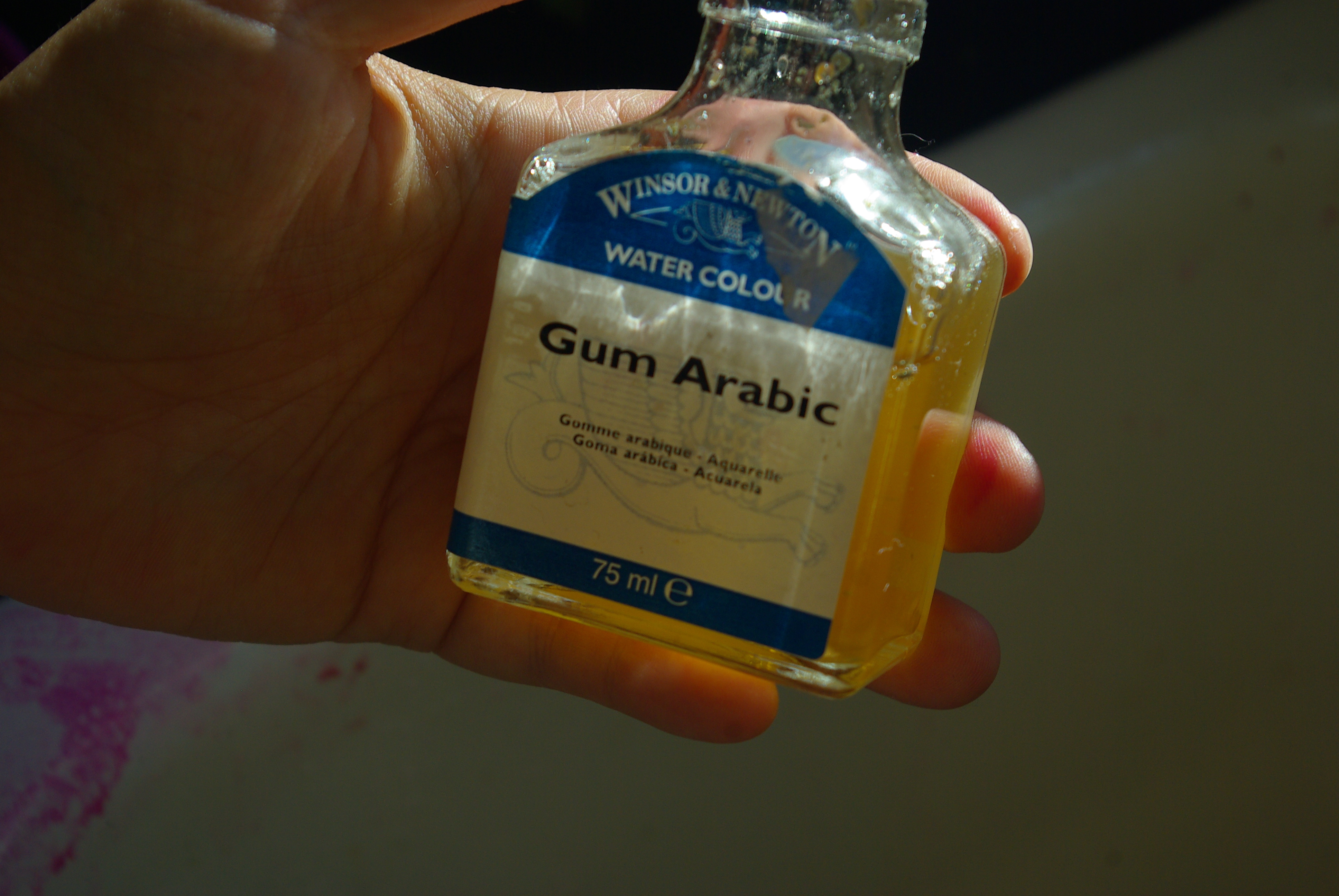I should say some more about gum arabic – you may find it also listed as acacia gum. You can get it in several forms: for painting in a refined liquid form, in a powder form, or in a resin form. I don’t recommend the resin form; its hard to get all the lumps out even if you grind it with a mortar and pestle. I’ve had the best luck with the liquid gum arabic used for watercolor painting. If you get the powdered form, add some water to it and let it sit overnight–you should end up with a thinnish gel once it is all dissolved. I have not had much success adding the powder right to the ink.