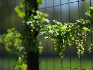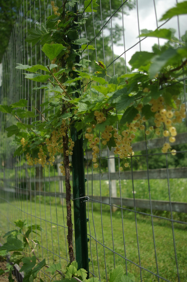 hardly noticeable. Perhaps it was being sold under the wrong name. If you want to grow pink currants, then try out the cultivar ‘Gloires des Sablons’ as well. I have trained my pink currant as an espalier along the garden fence. I was inspired by Lee Reich to utilize this space-saving training technique. Instead of being a 5’x5′ bush, it is trained similarly to a grapevine—occupying only vertical space.